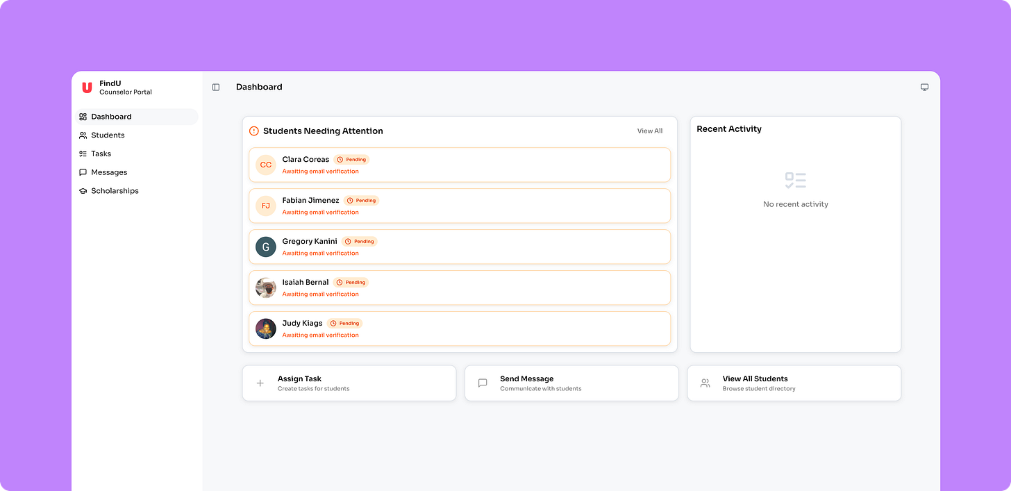 One of the biggest channels is working directly with high schools. Over the past few months, we’ve had conversations with counselors about what they’re actually dealing with. The reality is that most counselors are responsible for hundreds of students — sometimes 400 to 1. They don’t have time to sit with every junior and walk through their college list. They need tools that give them visibility without requiring more hours they don’t have.